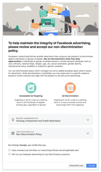 In addition to removing ad filters, Facebook will also be launching a certification tool within its Ads Manager platform that requires housing, employment and credit advertisers in the US to certify they are in compliance with Facebook’s non-discrimination policy.
