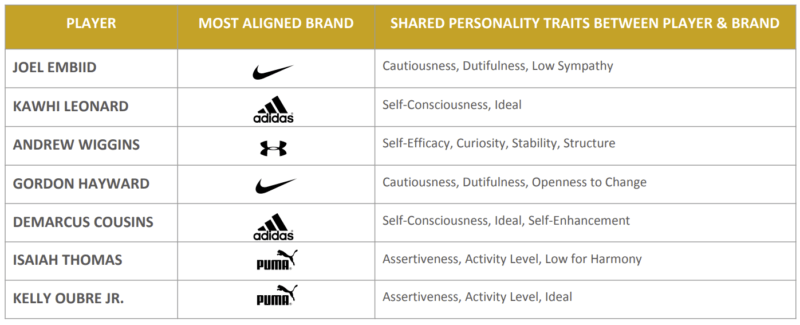 Four brands were analyzed (Nike, Adidas, Puma and Under Armour) and seven NBA players (Joel Embiid, Kawhi Leonard, Andrew Wiggins, Demarcus Cousins, Isaiah Thomas, Gordon Hayward and Kelly Oubre Jr.). During the analysis period — February through August of this year — all seven had shoe and apparel deals coming up for re-negotiation.